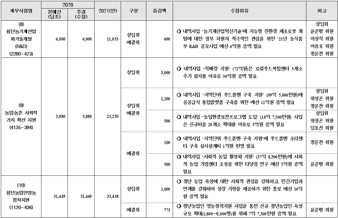 예결위 전체회의를 통해 종합정책질의, 경제부처, 비경제부처질의를 마치면 소위원회 심사 단계로 들어간다. 이 때 소위원들에게 전달되는 '소위 심사자료'의 ‘비고’란에 위원들의 증감액 의견이 들어간다(아래 이미지 참조). 이는 앞선 전체회의 동안 제출한 서면질의서가 반영된 결과이다.