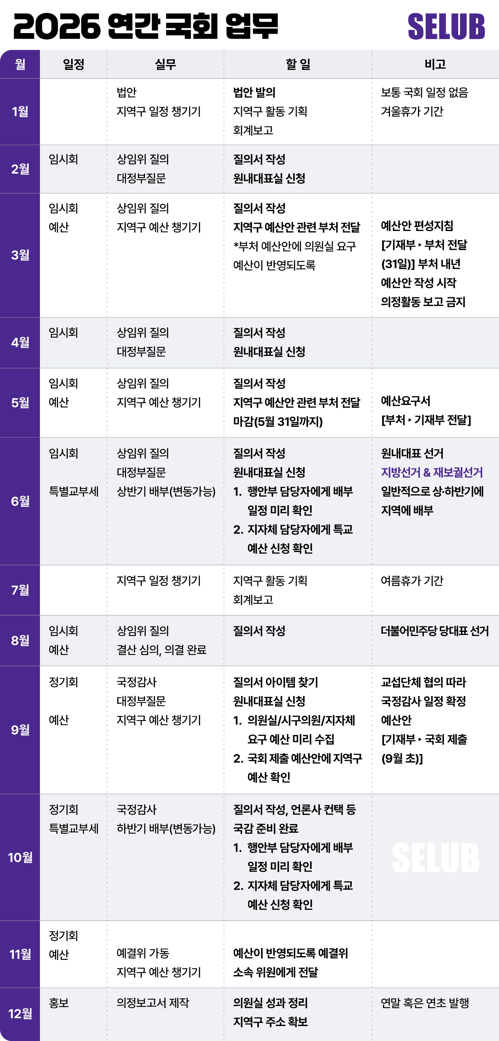 숨 가빴던 2025년을 뒤로하고, 격동의 2026년이 어느덧 코앞으로 다가왔습니다. 올해는 지방선거라는 빅 이벤트와 함께 재판, 외교 등 굵직한 변수들이 국회 시계를 더욱 빠르게 돌릴 것으로 예상됩니다. 언제 쉼표를 찍고 언제 전력 질주를 해야 할지, SELUB이 정리한 월별 로드맵을 통해 한 해의 흐름을 미리 선점해 보세요.