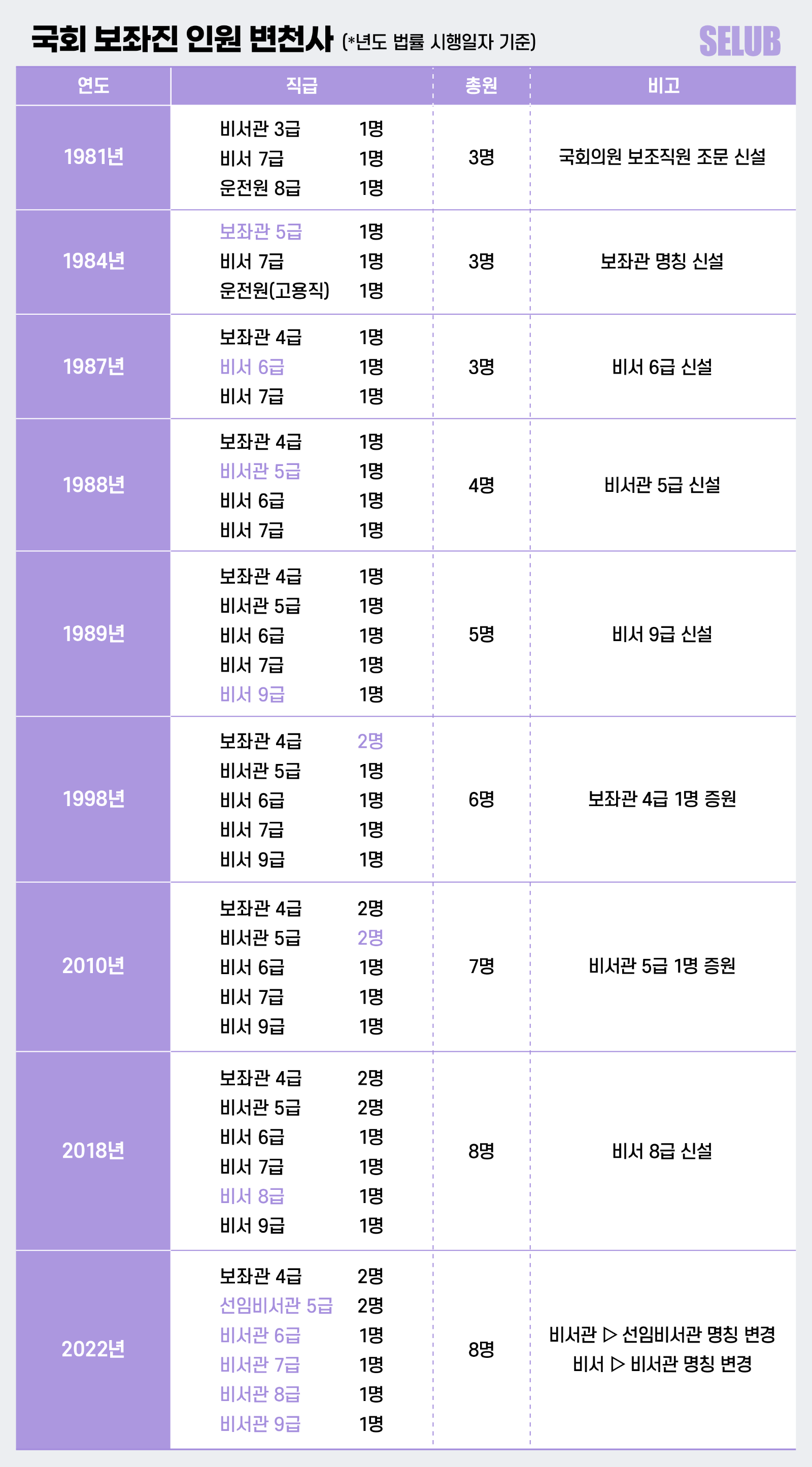 📍1981년 「국회의원 수당 등에 관한 법률」이 개정되면서 '국회의원의 입법활동을 지원하기 위하여 비서관등 보조직원을 둔다' 조문이 신설